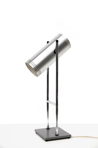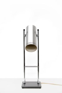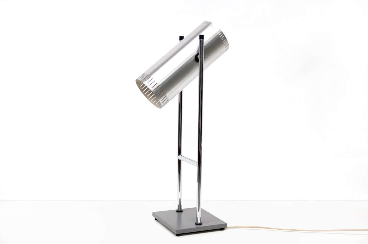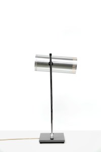 Omschrijving: Zeldzame Jo Hammerborg ‘Trombone 1’ tafellamp geproduceerd door Fog & Morup. Deze lamp is gemaakt van aluminium en heeft een grijs gelakte stalen voet. Een mooie design icoon van de bekende Deense ontwerper Jo Hammerborg, die een mooie plekje verdiend. De totale hoogte van de lamp is 57cm. De kap heeft een diameter van 10cm en is 25cm lang.