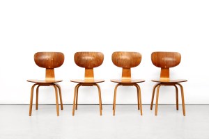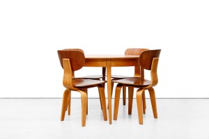 Omschrijving: Mooie eetkamer set van Cees Braakman voor Pastoe. De set bestaat uit 4 SB02 stoelen en een TB35 tafel. De poten van de stoelen zijn gemaakt van gebogen berken plywood en de zitting en rugleuning zijn teak gefineerd. Geweldig zijn de houten afwerk dopjes. De ronde tafel is gemaakt van massief berken houten en een teak gefineerd blad. De tafel is uitschuifbaar zodat er zeker 6 mensen aan kunnen zitten.