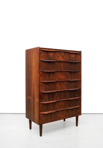 Omschrijving: Zeer mooi typisch Deens design cabinet met 6 lades. Uitgevoerd in een mooie kwaliteit palissander fineer en massief teak houten greepjes. Prachtig is ook de doorlopende houtnerf over de lades heen.