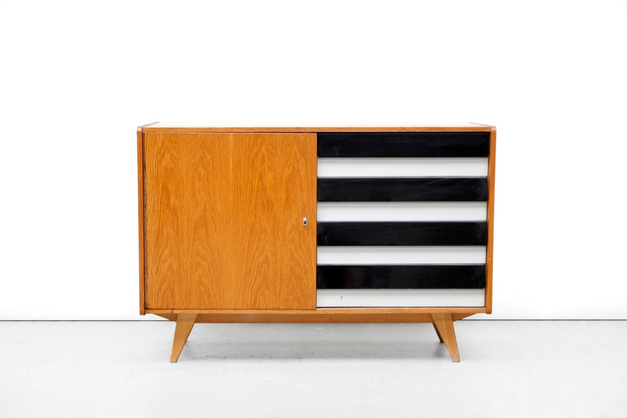 Omschrijving: Unieke ladekast van Jiri Jiroutek voor Interier Praha. Jiri Jiroutek is één van de grootste ontwerpers uit Tsjechië, hij ontwierp in de jaren 60 onder andere een serie kasten genaamd U450. Dit dressoir komt uit dezelfde serie. Deze kast is gemaakt van eiken hout. De lades zijn gemaakt van geperst plastic en zijn zeer goed schoon te houden. De lades hebben houten frontjes in zwart en wit, wat de kast een prachtig en bijzonder uiterlijk geeft.