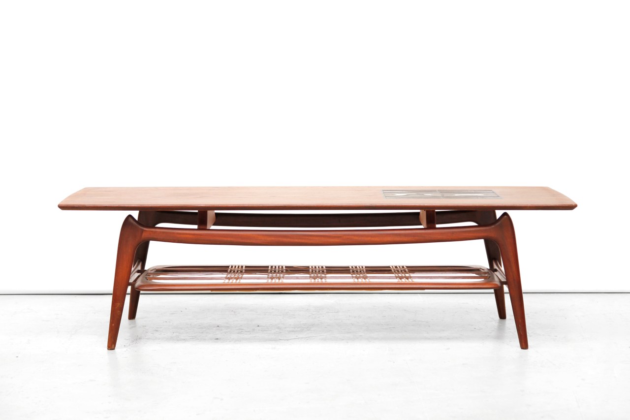 Omschrijving: Mooie organische salon tafel van Louis van Teeffelen voor WeBe. Gemaakt van massief teakhouten onderstel en teakfineer. Onder het blad is een webbing van rotan voor bijvoorbeeld magazines. Wat deze tafel bijzonder maakt zijn de prachtig vormgegeven organische poten en de ingelegde tegel van Jaap Ravelli. De tafel is 42,5 cm hoog, 150 cm breed en 50 cm diep.