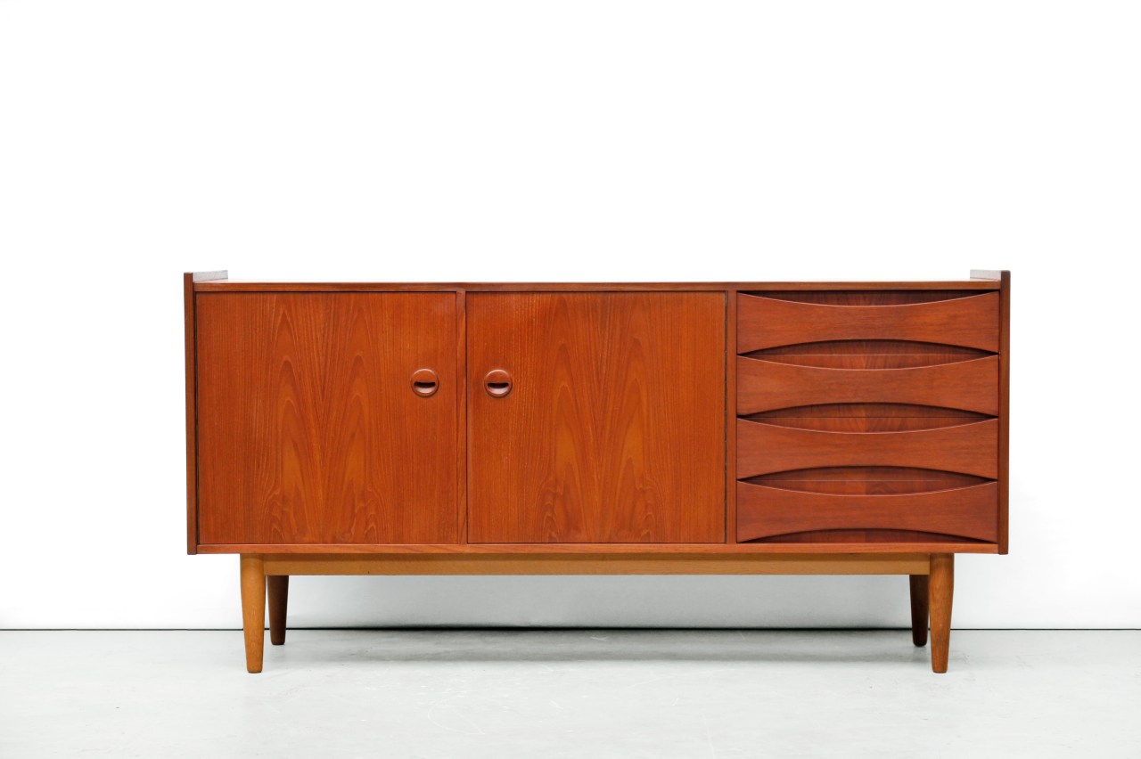 Omschrijving: Prachtig teakhouten sideboard van Oswald Vermaercke vervaardigd door de Belgische fabrikant V-form in het eind van de jaren 50. Dit dressoir is gemaakt van massief teak, teakfineer en een massief eikenhouten onderstel. Het ontwerp is beïnvloed door het werk van de Deense Arne Vodder met deze prachtige vormgegeven lades. Een echte eyecatcher voor in huis. Het dressoir heeft twee deuren, met daarachter een plank en 4 lades. Prachtige details en een kwalitatief mooi dressoir.