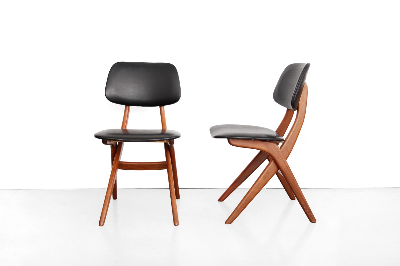 Omschrijving: Twee mooie organische stoelen van Louis van Teeffelen voor WeBe. De stoelen zijn gemaakt van massief teakhout en de zitting is opnieuw bekleed met zwart skai. Te gekke Deense vormgeving voor een Nederlandse design stoel. De stoelen zijn ook per stuk te koop.