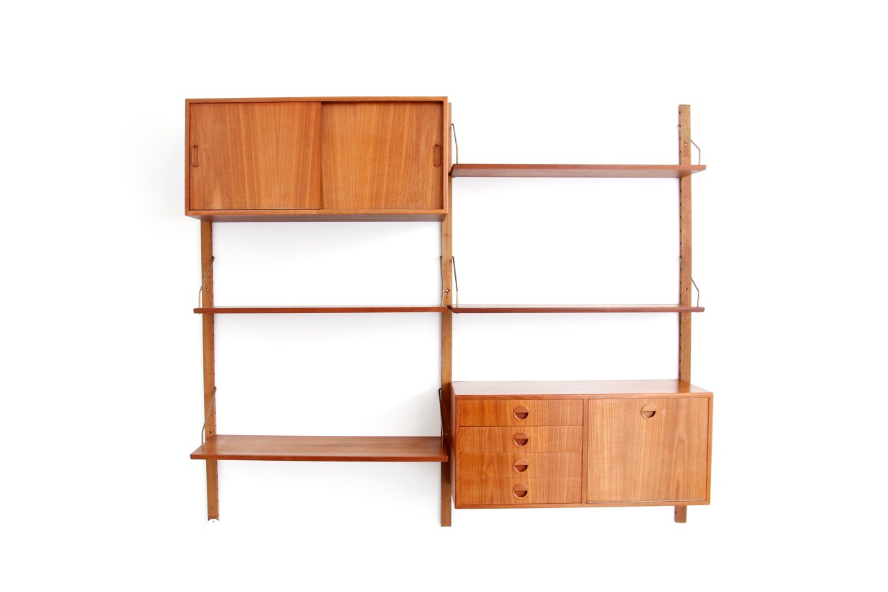 Omschrijving: Prachtige vintage modulaire Deense wandkast in de stijl van Poul Cadovius. Dit wandsysteem is alleen net iets mooier gemaakt. In plaats van rechte planken lopen de planken schuin af en zie je dat er echt aandacht is geschonken aan de afwerking. Ook de messing dragers zijn een mooie combinatie met het teakhout. Helaas is het systeem niet gemerkt en weten wij niet wie de ontwerper of fabrikant is, maar dat het erg mooi is, is geen twijfel over mogelijk.