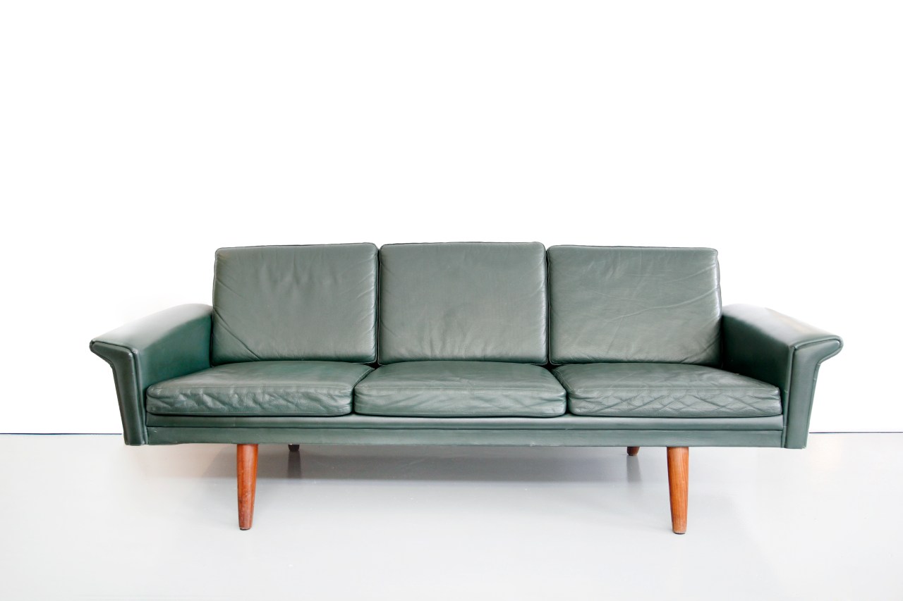 Omschrijving: Bijzonder mooie groen leren bank uit Denemarken. Deze driezits sofa is uitgevoerd in dik groen leer en heeft prachtige teakhouten conische pootjes. Het groen van het leer kleurt erg mooi bij de pootjes, mooier dan op de foto zichtbaar is. Deze prachtige bank is van super Deense kwaliteit. De bank is in totaal 195 cm breed, 74 cm diep en 66 cm hoog en de zithoogte is 40 cm.