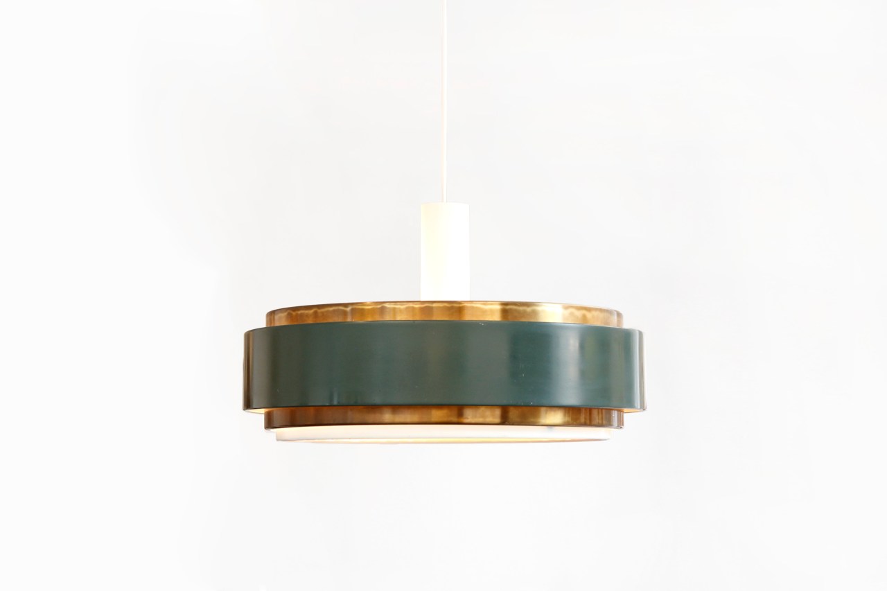 Omschrijving: Erg mooie hanglamp van Evolux. Model 8063. Bestaande uit twee messing ringen, een donker groene ring en een plastic diffuser. Een niet veel voorkomende lamp.