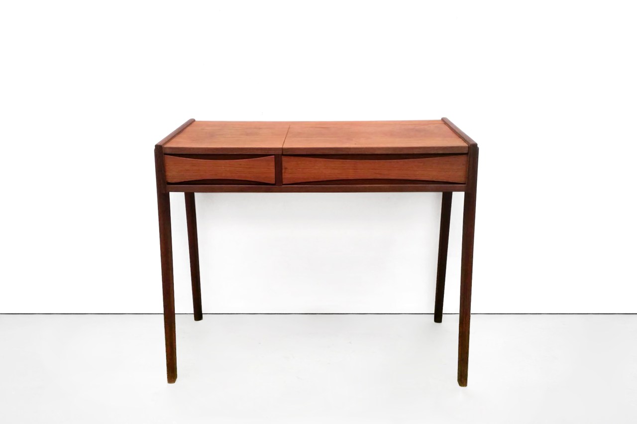 Omschrijving: Prachtig klein kaptafeltje / bureautje van Arne Vodder. Het tafeltje is gemaakt van teakfineer en massief teakhout. Herkenbaar zijn de greepjes die iconisch zijn van de Deense ontwerper. Het slanke tafeltje is zeer geschikt voor de slaapkamer, een tafel voor de hal of de woonkamer. Het tafeltje is 67 cm hoog, 82 cm breed en 38 cm diep.
