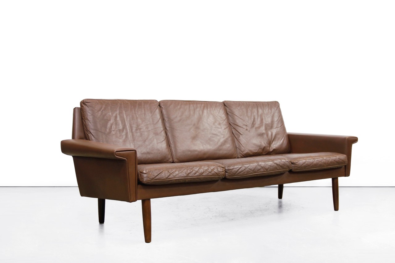 Omschrijving: Mooie bruin leren bank uit Denemarken. Deze driezits sofa is uitgevoerd in dik bruin leer en heeft teakhouten conische pootjes. Deze prachtige bank is van super Deense kwaliteit. De bank is in totaal 195 cm breed, 74 cm diep en 66 cm hoog en de zithoogte is 40 cm.