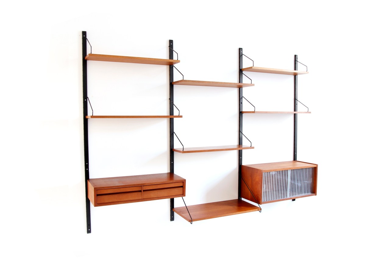 Omschrijving: Erg mooie teakhouten wandsysteem van Poul Cadovius voor Royal System uit Denemarken. Deze wandkast bestaat uit 4 staanders, 7 teakhouten planken en twee kastjes.