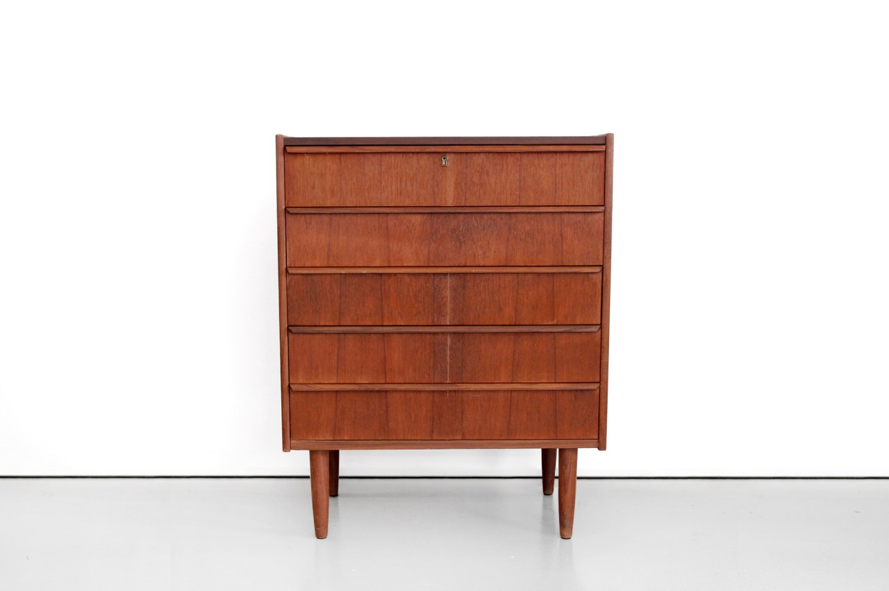 Omschrijving: Zeer mooi typisch Deens design ladenkast met 5 lades. Uitgevoerd in teak fineer en massief teak houten greepjes. Prachtig is ook de doorlopende houtnerf over de lades heen.