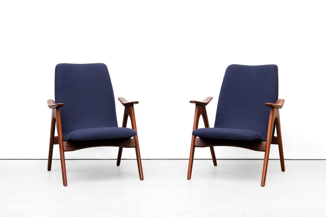 Omschrijving: Mooie set van twee design lounge stoelen met een frame van massief teak hout en nieuw gestoffeerd met donker blauwe wollen stof. De organische vormgeving van de stoel doet erg Deens aan. We hebben inmiddels een paar van deze fauteuils in onze collectie gehad waardoor wij vermoeden dat deze stoelen uit Nederland komen. Wij zien deze fauteuils veel als zijnde WeBe verkocht worden, maar helaas door het ontbreken van documentatie hierover, durven wij dit niet met zekerheid te zeggen. De fauteuils worden ook los van elkaar verkocht, maar onze voorkeur gaat uit naar de set. De totale hoogte van de fauteuil is 84 cm en hij heeft een zithoogte van 39 cm. De stoel is 67 cm breed.