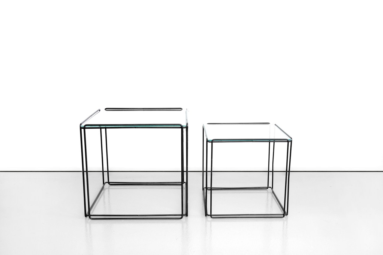 Omschrijving: Mooie set bijzettafels ontworpen door Max Sauze en gemaakt van zwart draadstaal en glazen tafelbladen. De glazen tafelbladen liggen los op het frame wat de lijnen strak en simpel houdt. Vooral het kubistische lijnenspel is echt prachtig aan deze tafels. Maar behalve dat ze erg mooi zijn, zijn ze ook multifunctioneel. Je kunt ze onder elkaar geschoven neerzetten, maar ook los in de ruimte als je ergens plots een bijzettafel nodig hebt of bijvoorbeeld een plantentafel. De tafels kunnen ook naast elkaar neergezet worden en gebruikt worden als salontafel. Mogelijkheden genoeg!