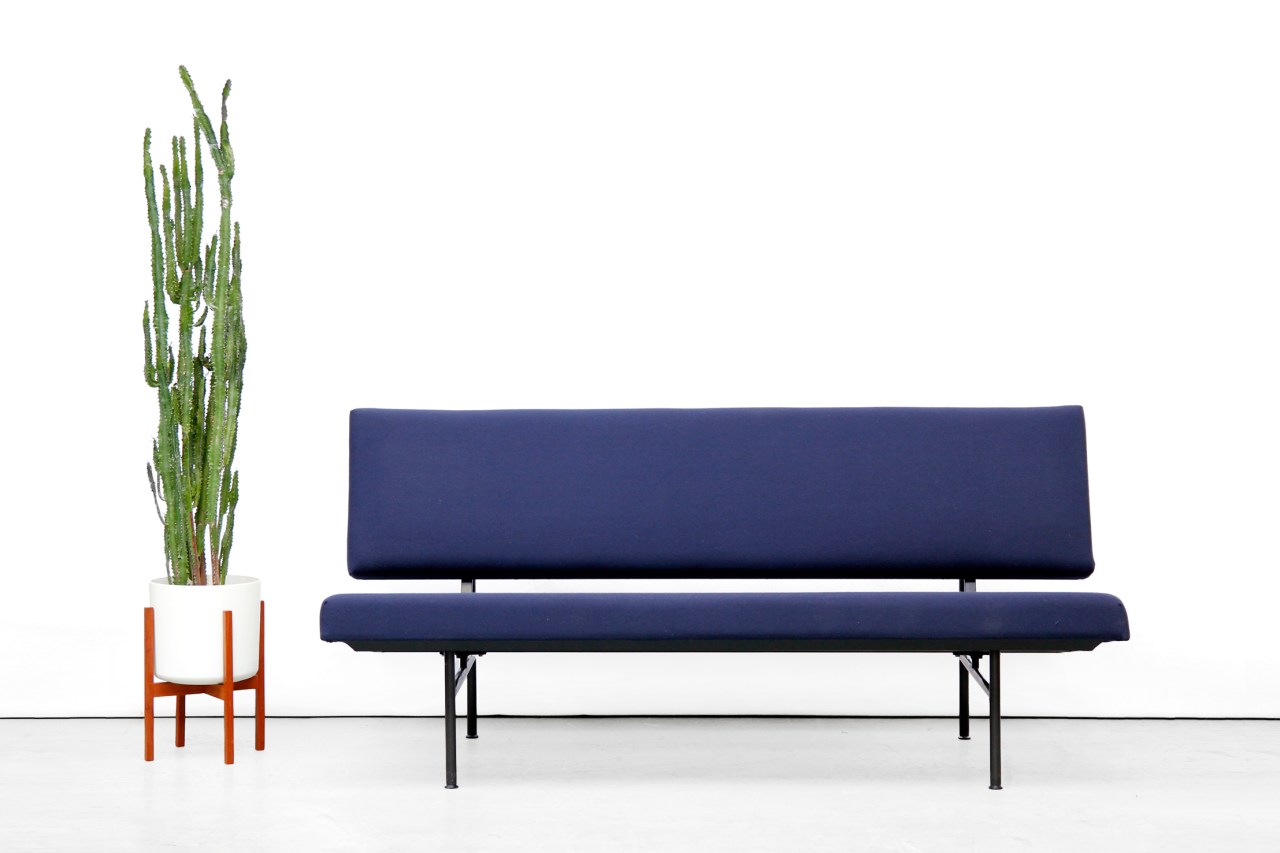 Omschrijving: Prachtig minimalistisch en stijlvolle bank van A.R. Cordemeijer voor Gispen. Het frame van de bank was vroeger leverbaar in twee verschillende uitvoeringen; namelijk verchroomd (bank no. 1720) en grafietzwart gelakt (bank no. 1721). Dit is model no. 1721, bekleed in een erg mooie donkerblauwe wollen meubel stof. Deze sofa is 75 cm hoog, 160 cm breed en 73 cm diep.