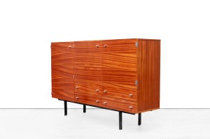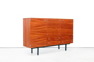 Omschrijving: Prachtig highboard ontworpen door Pierre Guariche voor Meurop. Dit strakke meubel komt uit België en is van zeer degelijke kwaliteit. De prachtige tekening in het teakhout is na restauratie weer goed zichtbaar geworden. Vooral de minimalistische zwarte metalen pootjes en de chromen handgreepjes zorgen voor de strakke minimalische vormgeving van de kast. Dit zorgt er ook voor dat de kast een zeer tijdloos karakter heeft en geschikt is voor elk type interieur. Deze kast is 116 cm hoog, 180,5 cm breed en 47 cm diep.