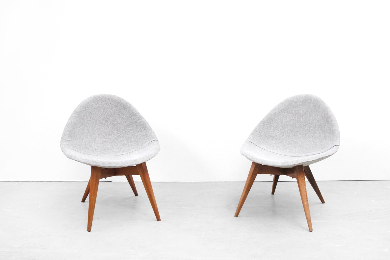 Omschrijving: Een setje van twee zeldzame ‘ei’ fauteuils die zijn ontworpen door Miroslav Navratil uit Tsjecho-Slowakije. De stoelen staan op een beukenhouten frame en hebben opnieuw gestoffeerde fiberglass zittingen. De stoelen werden geëxposeerd op de World Exposition in Brussel in 1958 en werden daar zeer goed ontvangen. De Tsjechische meubels uit deze periode worden daarom ook wel Brusel genoemd. Miroslav Navratil was een belangrijk Tsjechoslowaakse meubelontwerper. Hij was tijdens het ontwerpen zeer gericht op vooruitstrevende vormen en de technologische mogelijkheden om deze te bereiken. Zo zijn zijn fauteuils vaak een bijzondere combinatie tussen hout en polyester. Deze fauteuils zijn cm 69 hoog, cm 58 breed en hebben een zithoogte van 38 cm.