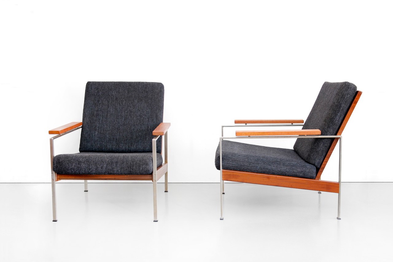 Omschrijving: Een setje van twee niet veel voorkomende Gelderland fauteuils, naar alle waarschijnlijkheid ontworpen door Rob Parry. Deze fauteuils hebben een fantastische tijdloze uitstraling door de minimalistische vormgeving. Een prachtige combinatie tussen wollen gestoffeerde kussens welke nog origineel zijn, een teak en verchroomd frame en teakhouten armleggers. Deze fauteuils zijn 74 cm hoog, 64 cm breed en 66 cm diep. De zithoogte is 38 cm.