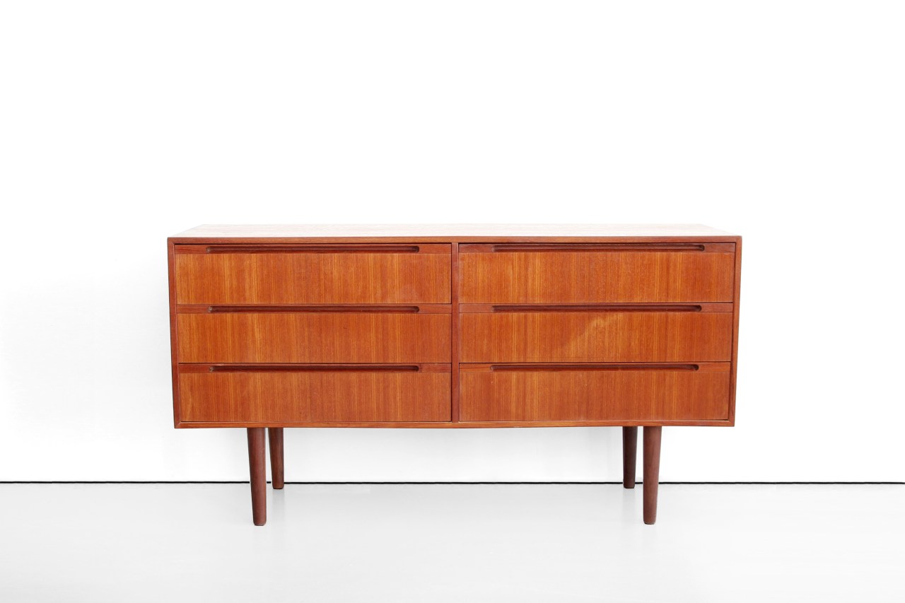 Omschrijving: Zeer mooi Deens design dressoir met 6 lades. Uitgevoerd in een mooie kwaliteit teak fineer en massieve diepliggende teak houten greepjes. Dit dressoir is ontworpen door Nils Jonsson voor de Deense HJN Mobler en is 141 cm breed, 75 cm hoog en 40 cm diep.