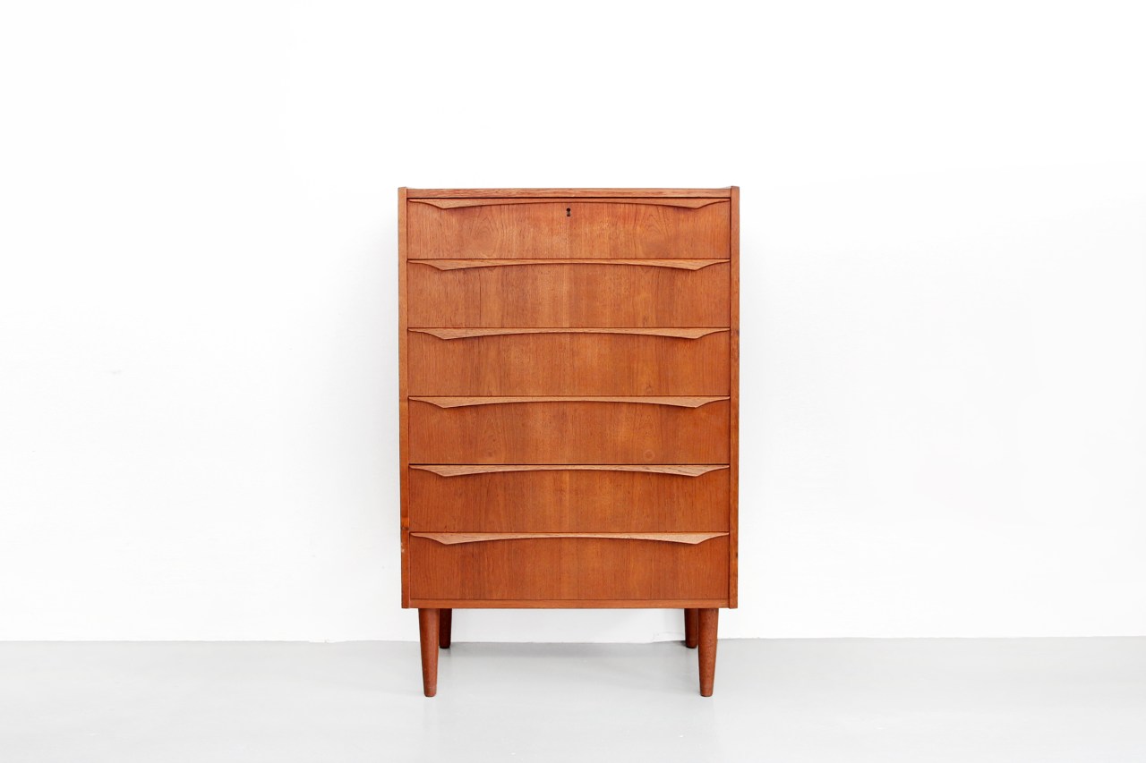 Omschrijving: Mooi en groot typisch Deens design ladenkast met 6 lades. Uitgevoerd in teak fineer en massief teak houten greepjes en pootjes. Mooie subtiele tekening in het hout. Zo groot zie je deze kasten niet vaak. Heerlijk formaat waar je veel in op kunt bergen. Deze kast kan ook goed gebruikt worden als commode. De kast is 108 cm hoog, 71 cm breed en 39 cm diep.