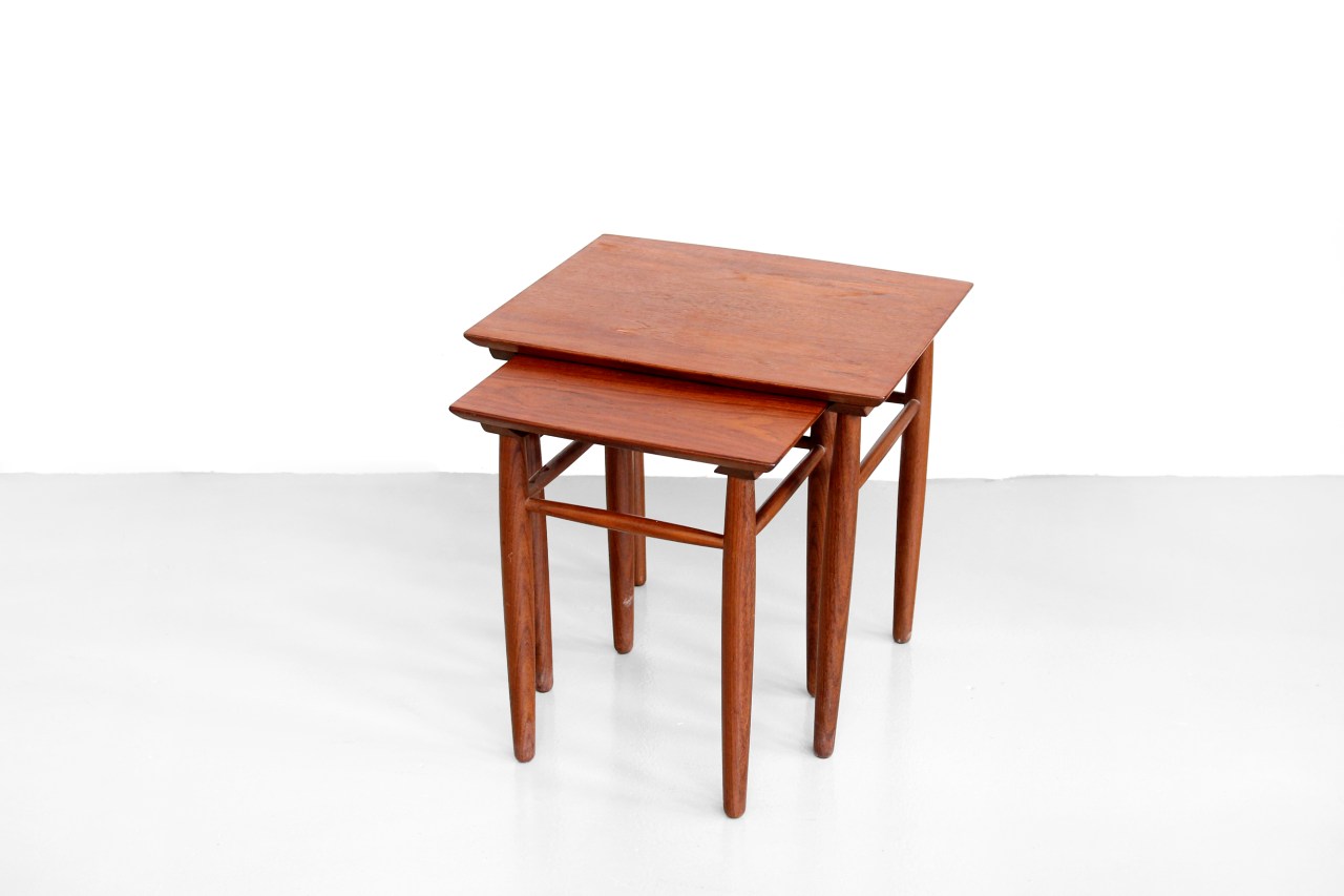 Omschrijving: Mooie set slanke teakhouten bijzettafeltjes rechtstreeks uit Denemarken. Een set bijzettafels wordt ook wel een mimiset of nesting tables genoemd en zijn zeer handig; je kunt ze namelijk makkelijk onder elkaar schuiven als je ze niet nodig hebt. Onder het blad zit een handig systeem waar je het kleinere tafeltje in kan schuiven. Zo zijn ze makkelijk te verplaatsen.