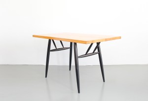 Staat: De set is nog helemaal origineel en voor zijn leeftijd in uitzonderlijk goede staat. De lak is in de loop der tijd vergeeld, wat de stoelen deze prachtige kleur geeft. Dit vind je alleen op de vintage modellen. Op het blad zijn wat lichte gebruikssporen te zien, die wij alleen maar vinden bijdragen aan de charme van deze vintage set. Desgewenst kan het geschuurd en opnieuw behandeld worden. Hiermee verlies je wel de kleur.