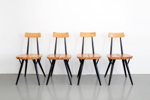 Omschrijving: Zeldzame complete eethoek ontworpen door de beroemde Finse ontwerper Ilmari Tapiovaara voor Laukaan Puu, Finland. Deze eethoek bestaat uit een eetkamertafel en vier stoelen, met modelnaam Pirkka. De set is gemaakt van massief grenenhout welke is afgewerkt met een transparante en zwarte laklaag. Deze Pirkka set wordt beschouwd als tijdloos scandinavisch design met een echte design klassieker status. Het setje is klein van formaat en daardoor zeer geschikt voor de kleinbehuisden. De tafel heeft een afmeting van 120 bij 70 cm en is 69 cm hoog. De stoelen zijn 75 cm hoog met een zithoogte van 43 cm.