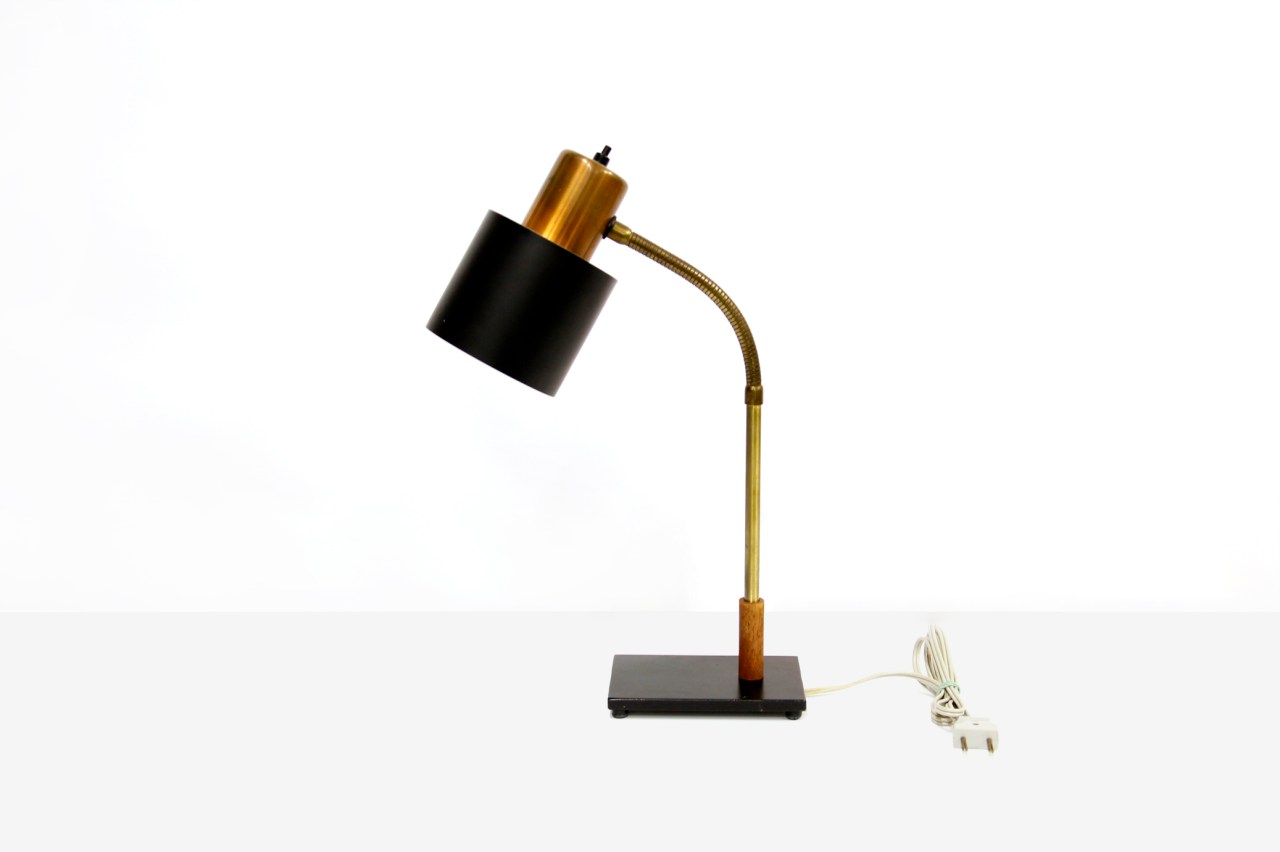 Omschrijving: Prachtige zeldzame tafellamp ontworpen door Jo Hammerborg voor Fog & Mørup. Deze tafellamp is ontworpen tussen 1957 en 1962 en is gemaakt van zeer mooie en degelijke materialen. Zo heeft deze lamp met modelnaam “beta” een gedeeltelijk flexibele messing stam met een teakhouten detail, en is de kap gemaakt van massief koper en een zwart gelakte ring die aan de binnenkant oranje is. Dit alles staat op een zwarte gelakte gietijzeren voet. Deze lamp kon je vandaag de dag niet veel meer tegen. Door zijn formaat is de lamp uitstekend geschikt als tafellamp, bureaulamp of nachtlampje. Zowel aan als uit trekt deze lamp veel aandacht. Een mooie lamp die goed zal staan in elk interieur.