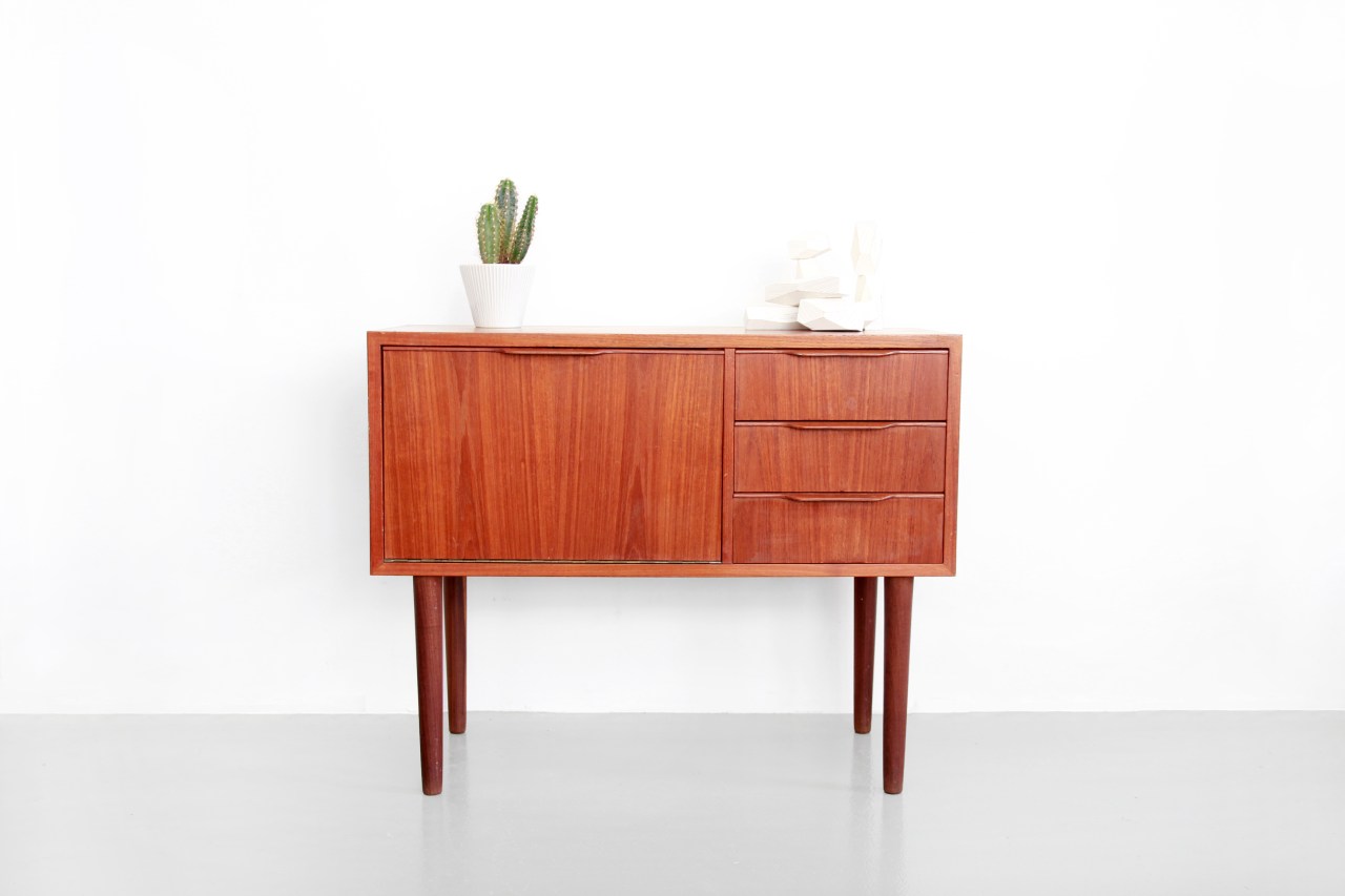 Omschrijving: Super leuk kastje uit Denemarken gemaakt van teakhout. De kast heeft één klep een drie laadjes met typische Deense massief houten greepjes. Het kastje is uitermate geschikt als kastje voor in de gang, maar kan ook zeer goed als opbergmeubel in de woonkamer of slaapkamer gebruikt worden. Dit kastje is is 75cm breed, 61 cm hoog en 35 cm diep.
