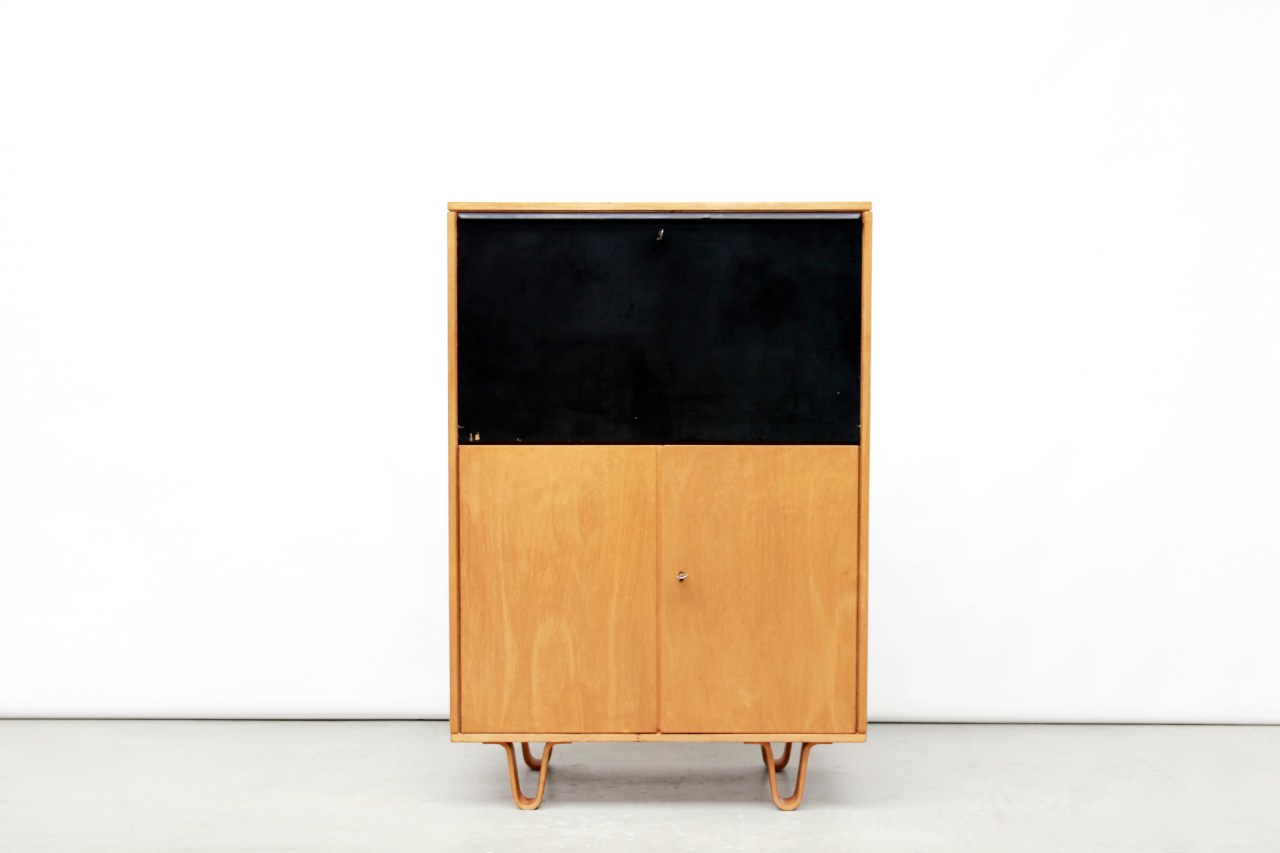 Omschrijving: Zeer mooie secretaire van Cees Braakman uit de bekende Berkenserie van Pastoe. De gebogen berkenhouten pootjes zijn kenmerkend voor deze serie. Deze prachtige kast kan gebruikt worden om in op te bergen, maar door de zwarte klep met daarachter het handige opbergvak is deze kast ook zeer goed te gebruiken als bureau. Aan de nieuwe werkplek die de klep heeft gecreëerd, kan namelijk makkelijk gewerkt worden met een laptop. Zeer handig voor mensen die klein behuisd zijn.