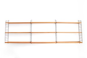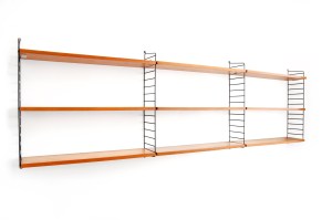 Omschrijving: Mooi String wandrek van Nisse Strinning. Wat ooit zijn afstudeerproject was, is nu een gewild item in een modern interieur. De planken zijn uitgevoerd in gefineerd grenen hout en zijn 80 cm breed en 20 cm diep. Op de foto staat het rekje als een geheel afgebeeld. Het rek zou ook als twee losse rekjes opgehangen kunnen worden. Zoals op de foto afgebeeld is het rek 238 cm breed.
