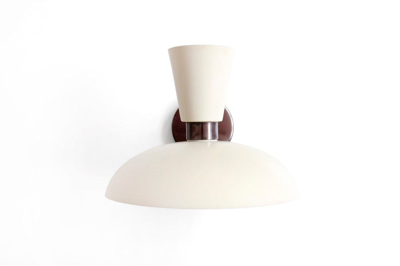 Omschrijving: Zeer mooie wandlamp toegeschreven aan Stilnovo, Italiaans design uit de jaren 50. Deze wandlamp heeft de vorm van een diabolo met twee wit gelakte kappen en een gebronsd stalen arm. Deze lamp heeft twee lichtpunten, en kan dus zowel naar boven als naar beneden schijnen. De grote kap heeft een E27 fitting en de wat kleinere kap een E14 fitting. Deze lamp is in uitstekende originele staat en is gemaakt van hoge kwaliteit. De lamp is 28 cm diep, 20 cm hoog en de grootste kap heeft een diameter van 25 cm.