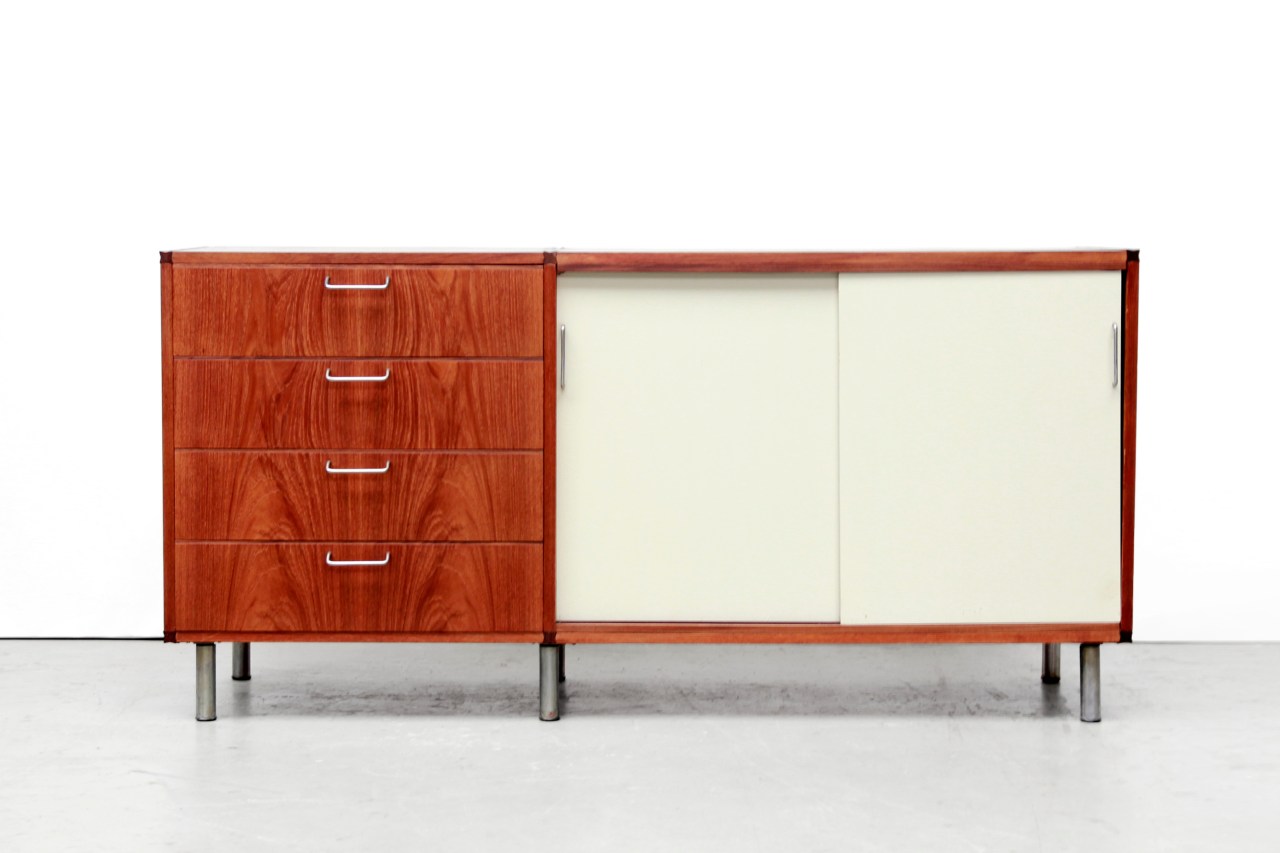 Omschrijving: Prachtig tijdloos dressoir van Cees Braakman voor Pastoe. Dit dressoir komt uit de ET62 serie waarbij er gebruik is gemaakt van chromen handgreepjes en verstelbare chromen pootjes. Kasten uit de ET62 serie zijn vrij zeldzaam en worden ook wel Pastoe naar Maat, of Made to Measure genoemd. Het sideboard bestaat uit twee originele witte schuifdeurtjes en vier teak lades, met gebogen ‘anti-dust’ plywood binnenzijdes. Het dressoir is 154 cm breed, 45 cm diep en 76 cm hoog.