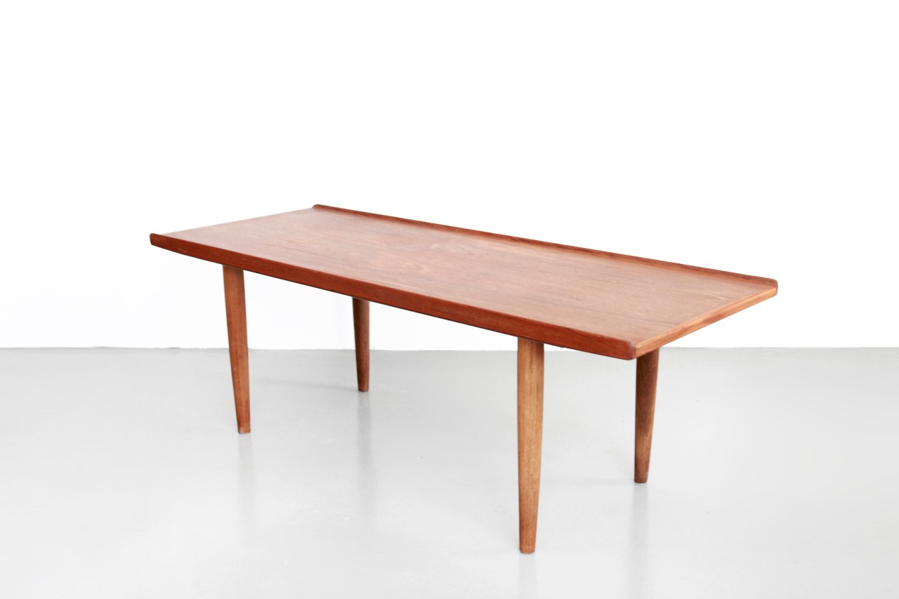 Omschrijving: Mooie teakhouten salontafel uit Denemarken in de stijl van Bovenkamp. Het blad heeft opstaande randjes van massief hout en heeft elegante conische houten pootjes. Het blad zelf is teak gefineerd.