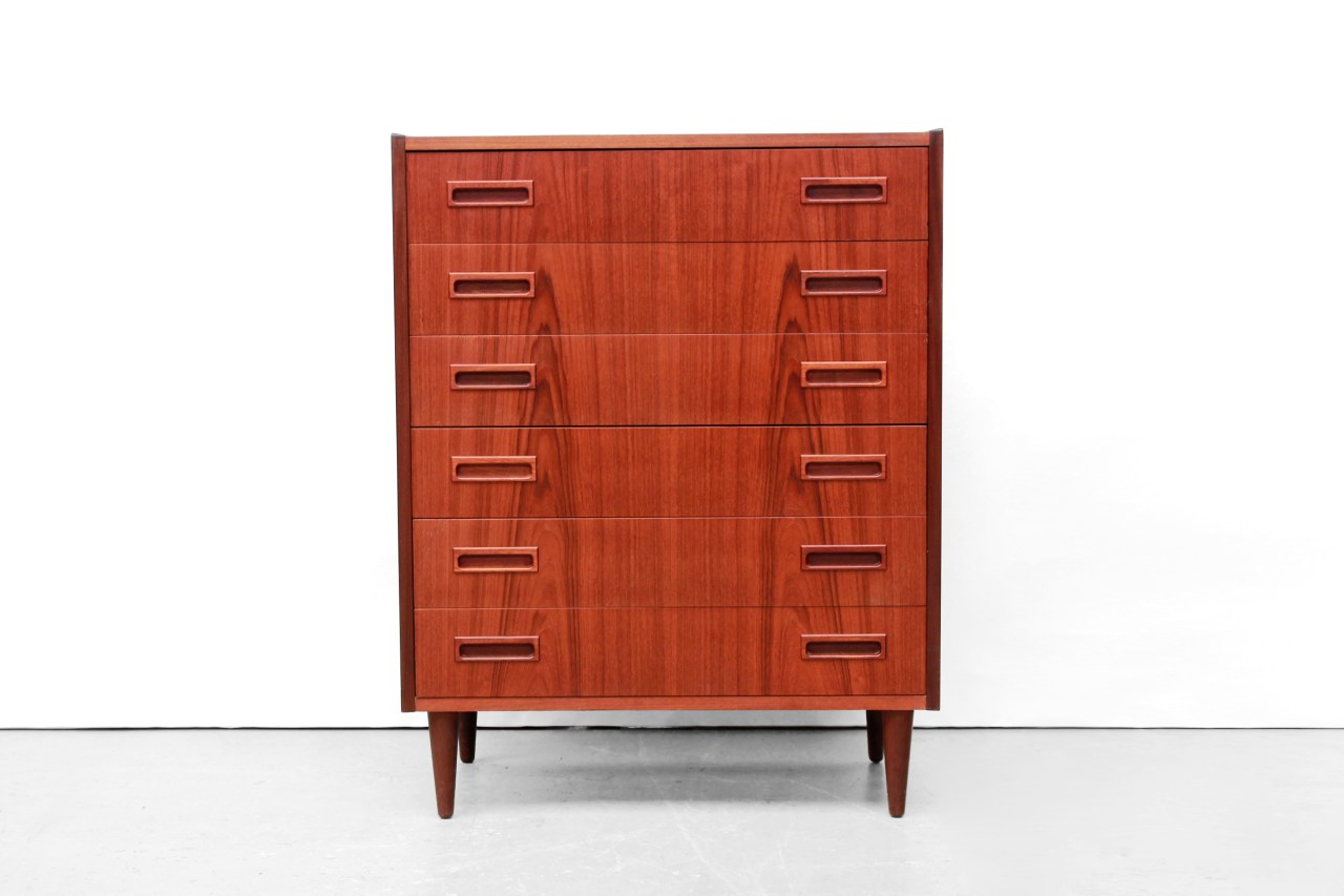 Omschrijving: Prachtige Deens design ladenkast met 6 lades. Uitgevoerd in teak fineer en massief teak houten greepjes. Vooral de vormgeving van de kast en de doorlopende tekening van het hout, maakt het kastje een lust voor het oog. Erg mooi en multifunctioneel opbergmeubel. De afmeting van de kast is 78 cm breed bij 43 cm diep bij 100 cm hoog.