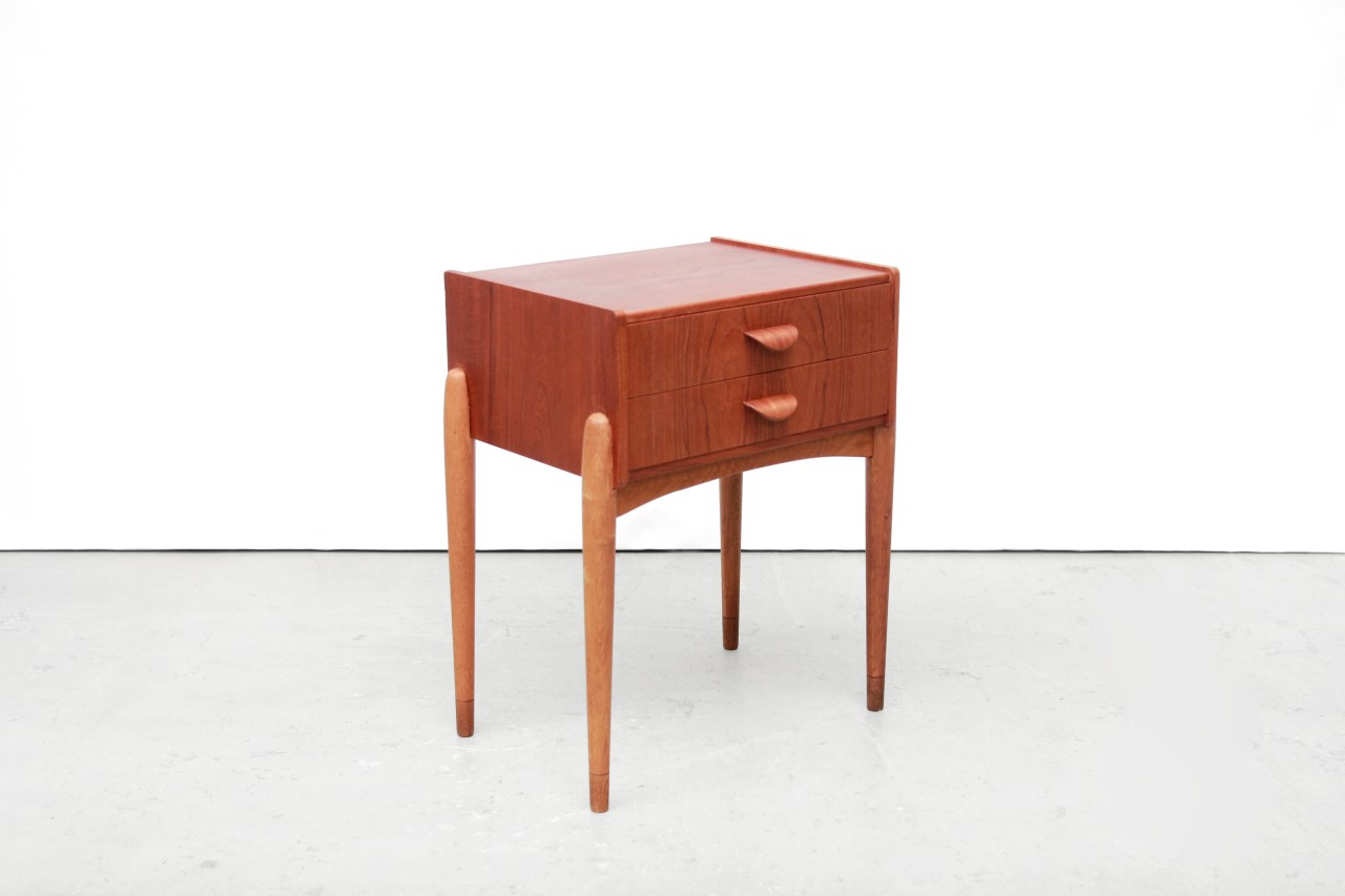Omschrijving: Super leuk Deens design nachtkastje. Goede combinatie van strakke lijnen en organische vormen. Het kastje heeft twee lades is gemaakt van teak fineer en massief eikenhout. Perfect te gebruiken als nachtkastje, maar past natuurlijk ook in een woonkamer of leuk in de gang onder een spiegel. Het kastje is 42cm breed bij 32cm diep en 56cm hoog.