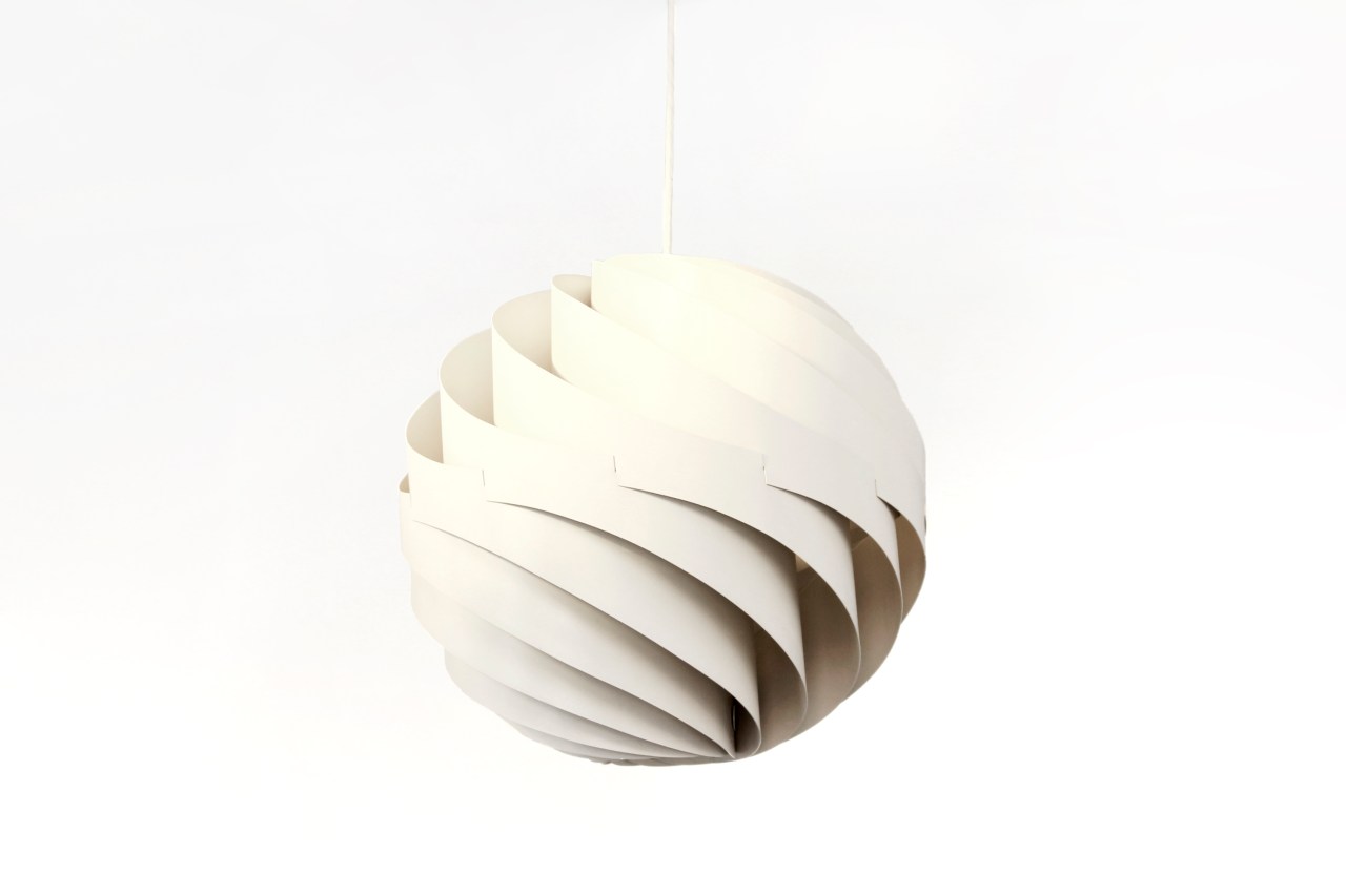 Omschrijving: Prachtige lamp van Louis Weisdorf voor LYFA. De lamp heeft de naam ‘Turbo I’ en is gemaakt van wit gelakte aluminium lamellen die in elkaar gedraaid zijn waardoor er een bol ontstaat. De lamp op zichzelf is een prachtig sculptuur, maar als de lamp aan staat geeft hij ook nog eens mooi licht. De diameter van deze lamp is 36 cm.