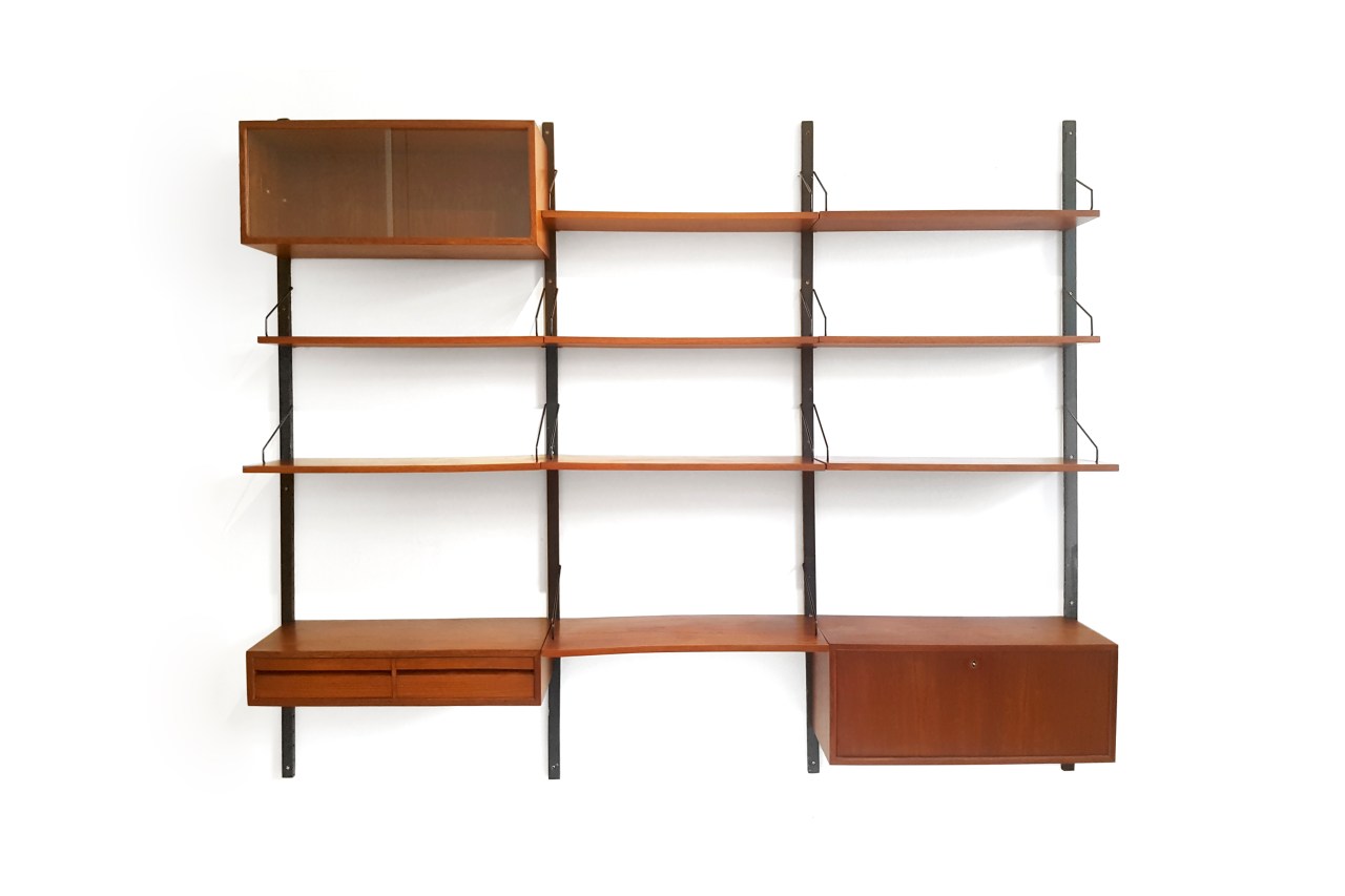 Omschrijving: Erg mooi teakhouten wandsysteem van Poul Cadovius voor Royal System uit Denemarken. Deze wandkast bestaat uit 4 zwart gelakte staanders, 4 diepe teakhouten planken van 30 cm diep, 4 planken van 20 cm diep en 3 kastjes, waarvan 1 met glazen schuifdeuren, 1 met klep en 1 met twee laden. Dit systeem is makkelijk naar eigen smaak in te delen. Het is niet alleen een pracht object in huis, maar ook nog eens heel functioneel. De totale breedte van de kast zoals afgebeeld op de foto is 245 cm.