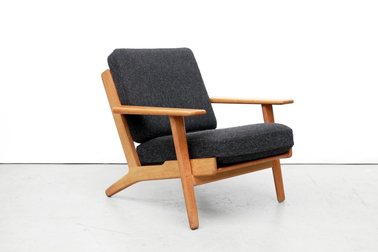 Omschrijving: Prachtige klassieker van Hans J. Wegner voor Getama uit Denemarken. Dit model, GE290, is gemaakt van massief eikenhout en de originele kussens zijn bekleed met een antraciet gemêleerde wollen stof van Kvadrat. Geweldig iconisch ontwerp van misschien wel de bekendste ontwerper uit Denemarken. Naast het ontwerp en de hoge kwaliteit zit de fauteuil ook nog eens heerlijk. De fauteuil is 70 cm hoog, 85 cm diep en 75 cm breed. De zithoogte is 43 cm.