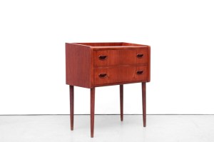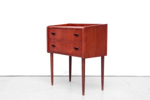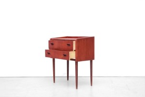 Omschrijving: Zeer mooi typisch Deens design cabinet met 2 lades. Uitgevoerd in een mooie kwaliteit teak fineer en massief teak houten greepjes. Prachtig is ook de doorlopende houtnerf over de lades heen. Door zijn formaat is dit kastje op veel plekken neer te zetten. Bijvoorbeeld in de gang onder een spiegel, als nachtkastje of als bijzettafeltje met opbergruimte. Dit kastje is 58,5 cm breed, 33,5 cm diep en 68,5 cm hoog.