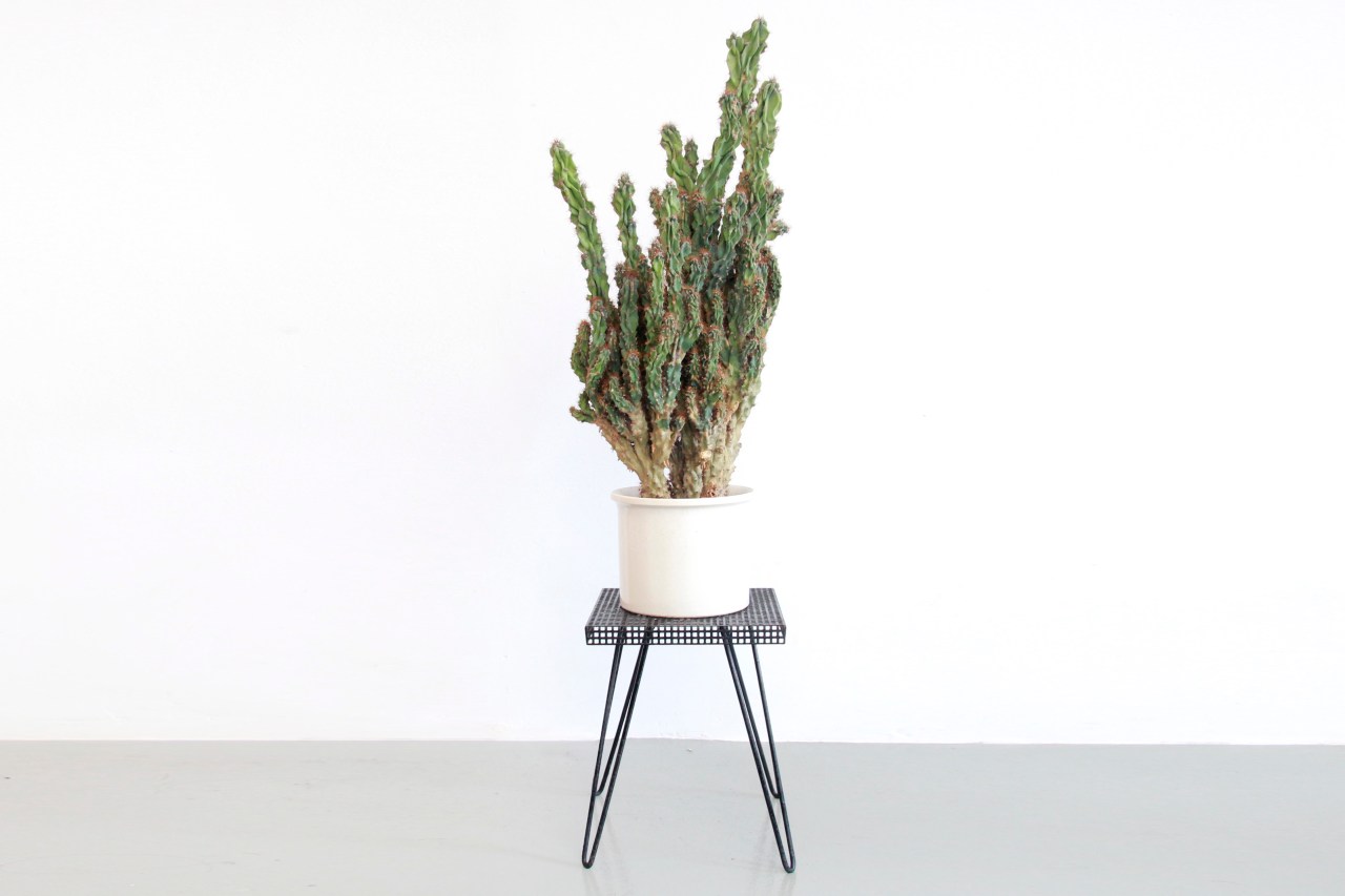 Omschrijving: Hele leuke metalen plantenstandaard of bijzettafel met prachtige metalen hairpin pootjes en een geperforeerd metalen blad. Omdat je door het blad heen kunt kijken, zijn de poten erg mooi aan het blad gemonteerd. Hierdoor ziet men een plus of kruis vorm. Zowel binnen als buiten te gebruiken.