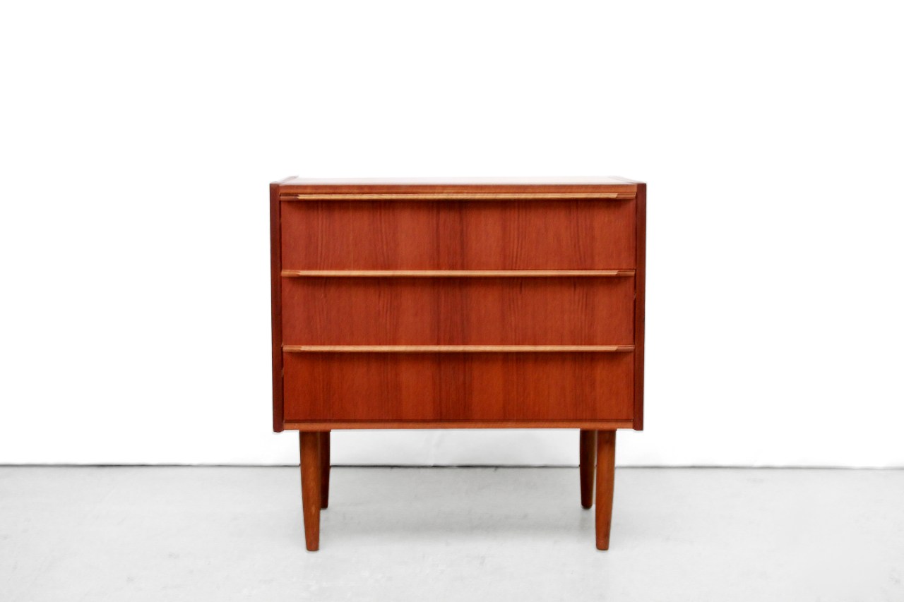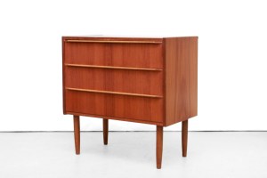 Omschrijving: Prachtige Deens design ladenkast met 3 lades. Uitgevoerd in teak fineer en zeer mooi gevormde teak houten greepjes. Vooral de houtnerf die doorlopen over de laden heen, aan de voorkant van de kast, maakt het kastje een lust voor het oog.