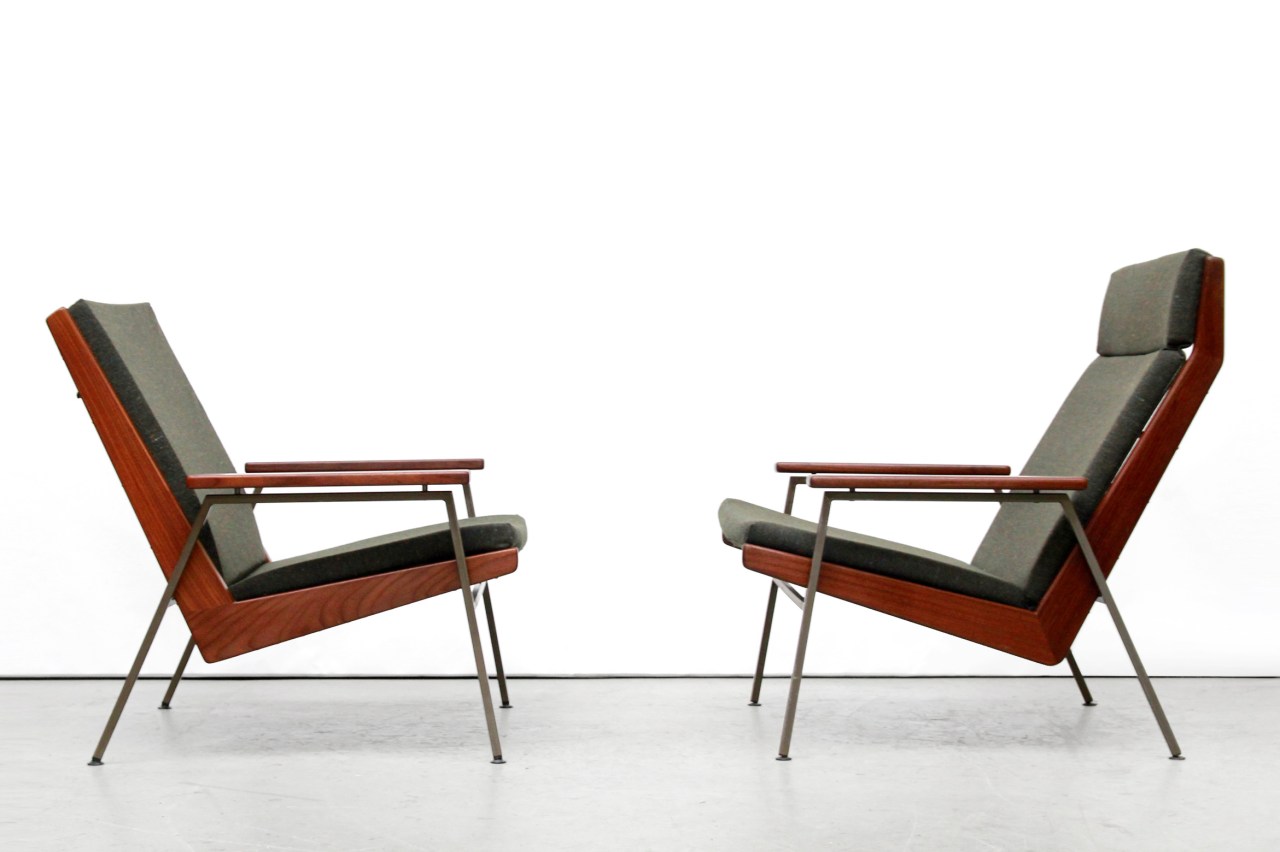 Omschrijving: Een set van 2 ‘Lotus’ fauteuils van Rob Parry voor Gelderland. Het model ‘lotus’ is gemaakt van een stalen onderstel, massief teakhouten frame, rubberen singels en gestoffeerde schuimrubberen kussen. De gemêleerde groene stof is 100% wol. Na het weven is de stof gewassen waardoor de stof een vilt-look heeft. Deze twee iconen hebben een prachtig Nederlands Minimalistisch ontwerp en zitten heerlijk. Echt een aanwinst voor elk interieur.
