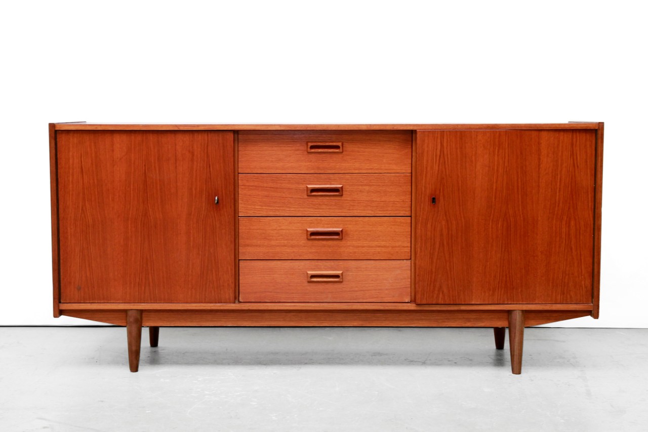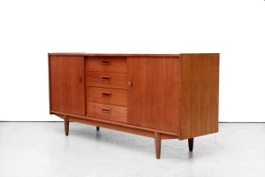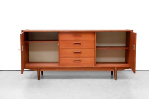Omschrijving: Mooi teakhouten dressoir van Nederlandse bodem. Duidelijk geïnspireerd op de Deense meubels uit de jaren 60, maar wel met de nuchtere Nederlandse strakke lijnen. Het dressoir is gemaakt van teakfineer en massief teakhout. Dit sideboard heeft twee deurtjes en 4 lades die zorgen voor voldoende opbergruimte. Het dressoir is 157 cm breed, 41 cm diep and 73 cm hoog.