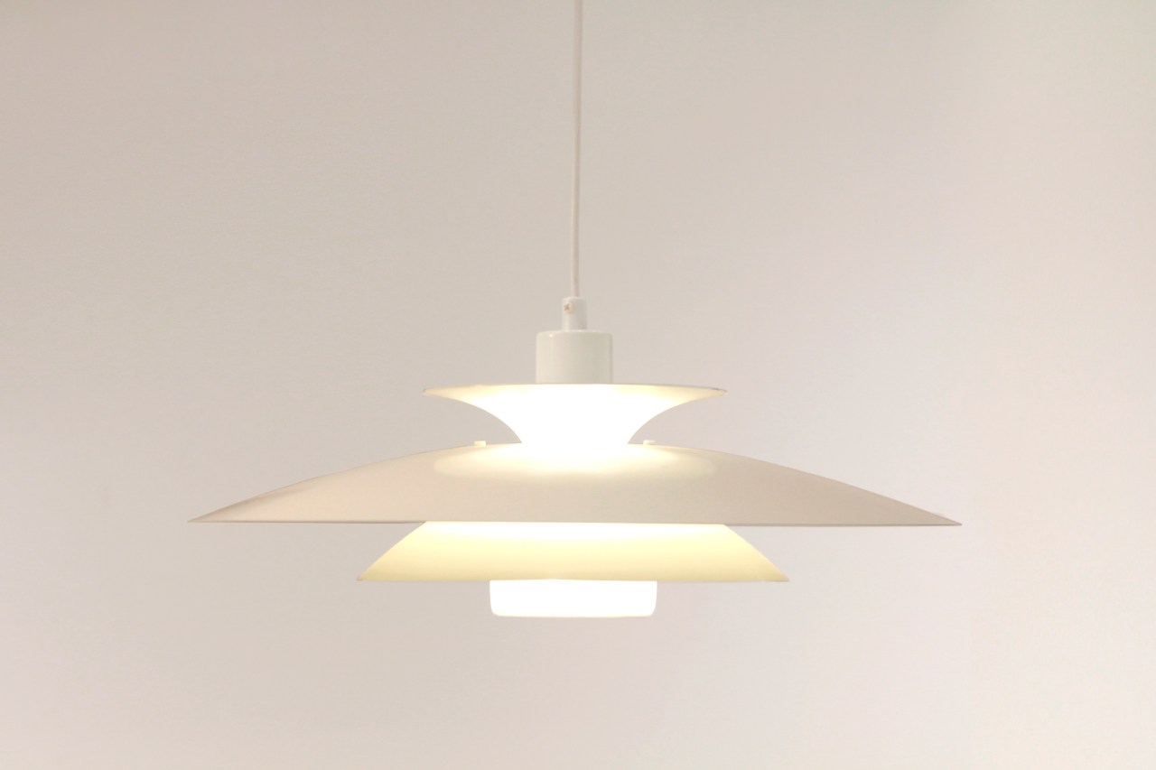 Omschrijving: Witte vintage Deens design hanglamp in de stijl van Poul Henningsen en Louis Poulsen. De lamp is geproduceerd in de jaren 60 en schijnt niet alleen licht naar beneden maar ook naar boven. Deze lamp heeft een diameter van 47 en is ongeveer 25 cm hoog.