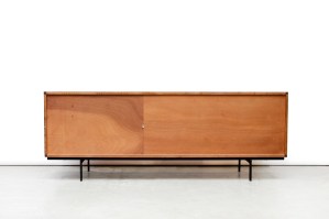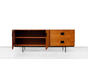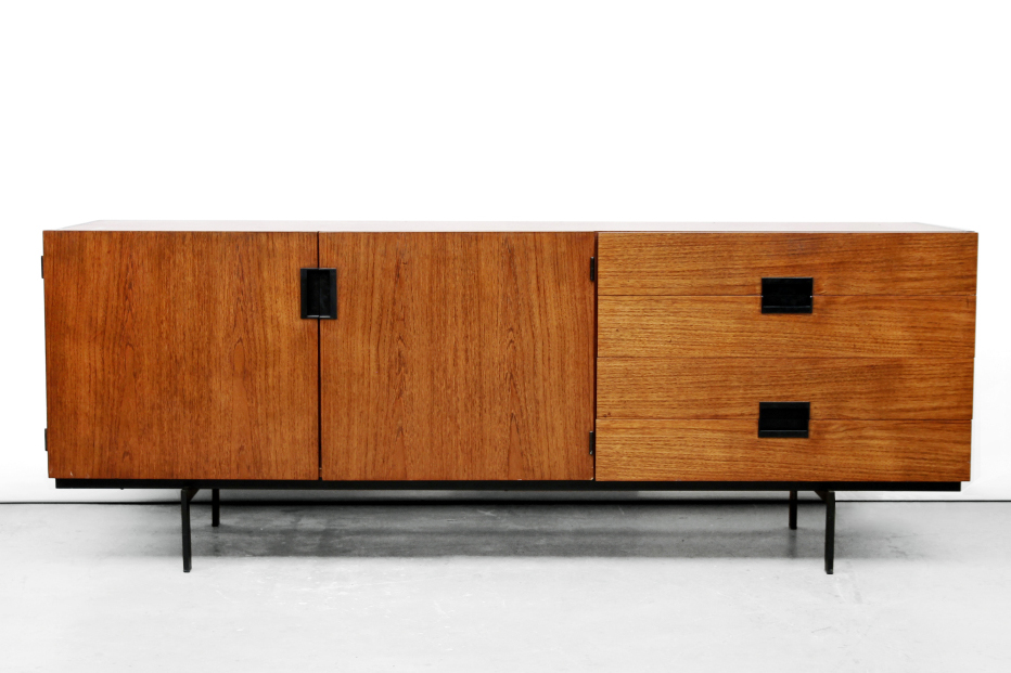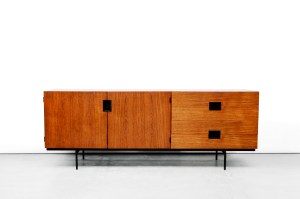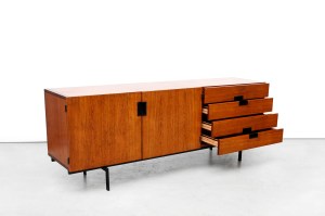 Omschrijving: Prachtig minimalistisch en stijlvol dressoir van Cees Braakman voor Pastoe. Dit dressoir heeft de naam DU04 en is gemaakt van teakhout. Dit sideboard komt uit de bekende serie van Pastoe die omgedoopt is tot de ‘Japanse Serie’ door zijn strakke vormen en eenvoud. De kast heeft vier anti-dust lades, twee deuren met daarachter een plank en staat op een elegante zwart stalen onderstel. In de jaren vijftig geproduceerd en vandaag de dag nog super modern. Echt Nederlands top design!