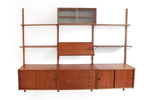 Omschrijving: Erg mooi teakhouten wandsysteem in de stijl van Poul Cadovius maar dan afkomstig uit Zweden. Deze wandkast bestaat uit 4 houten staanders, 2 diepe teakhouten planken van 30 cm diep, 2 planken van 20 cm diep, een magazine plank en 4 kastjes, waarvan 1 met glazen schuifdeuren, 2 met houten schuifdeuren en 1 met vier laden. Dit systeem is makkelijk naar eigen smaak in te delen. Het is niet alleen een pracht object in huis, maar ook nog eens heel functioneel. De totale breedte van de kast zoals afgebeeld op de foto is 245 cm.