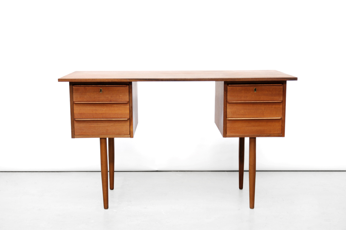 Omschrijving: Stijlvol simpel Deens design bureau gemaakt van teakhout. Prachtige slanke pootjes, 6 lades voor voldoende opbergruimte en een teak gefineerd blad. Meer heb je niet nodig. Een heel handig bureautje voor als je niet al te veel ruimte hebt of voor bijvoorbeeld een tienerkamer. Het bureau is 120 cm breed, 70,5 cm hoog en 58,5 cm diep.
