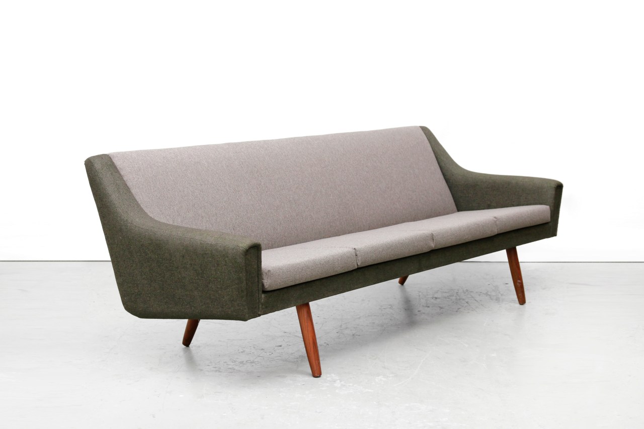 Omschrijving: Vintage Deens Design bank in de stijl van Illum Wikkelso. Deze prachtige two tone vierpersoonsbank is gestoffeerd in twee contrasterende kleuren, namelijk in mos groen met grijs. De bank zit heerlijk en is een aanwinst voor elk interieur. De bank is 215 cm breed, 75 cm diep en 72 cm hoog. Hij heeft een zithoogte van 42 cm.