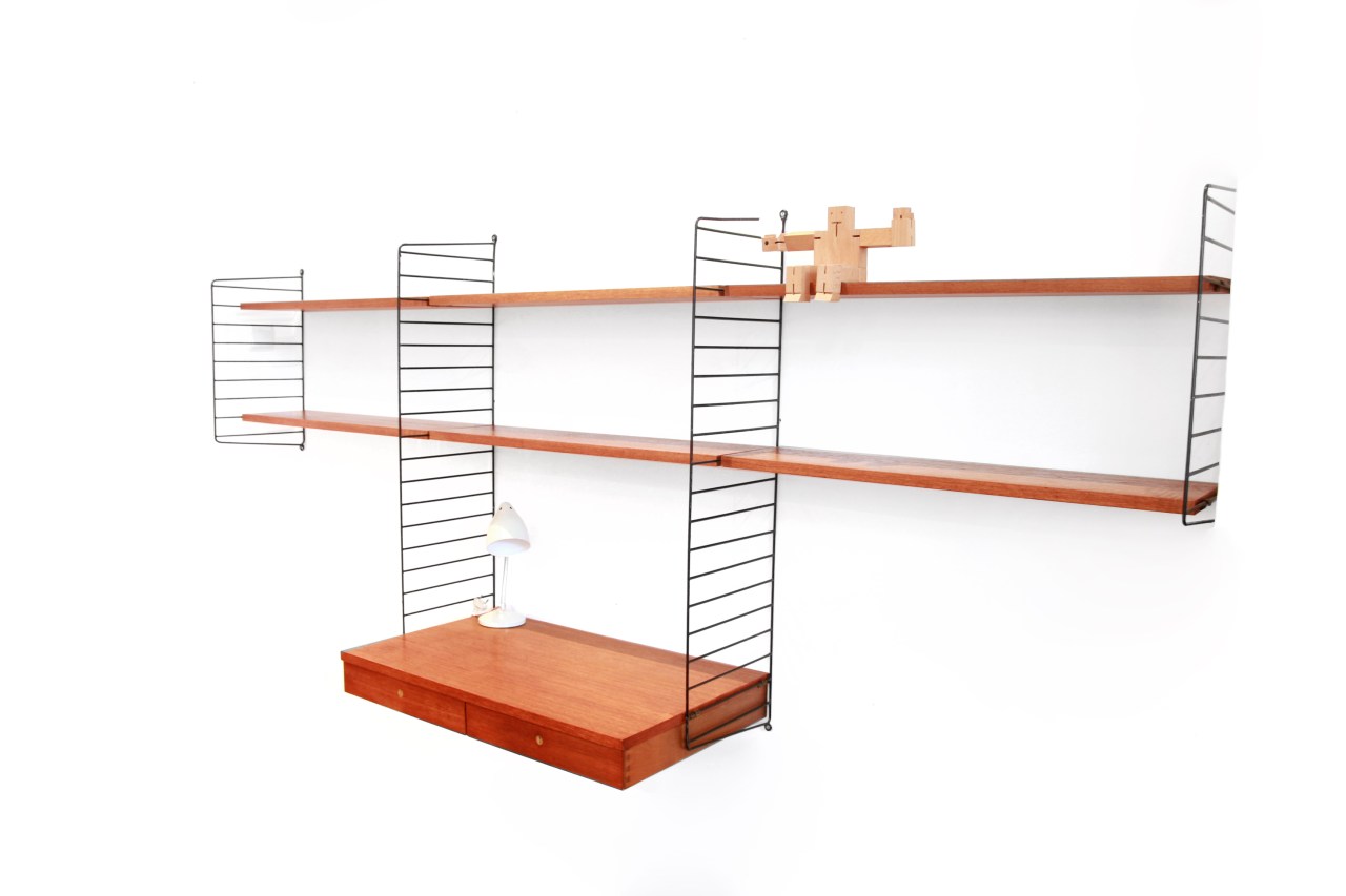 Omschrijving: Mooi String wandrek van Nisse Strinning. De planken en het bureau met twee lades zijn uitgevoerd in gefineerd teak hout en zijn 80 cm breed. Deze set bestaat uit 4 staanders, 6 planken en een bureau element. De sleutels zijn nog aanwezig. Op de foto staat het rekje als een geheel afgebeeld. Het rek zou ook als twee losse rekjes opgehangen kunnen worden. Zoals op de foto afgebeeld is het rek 238 cm breed.