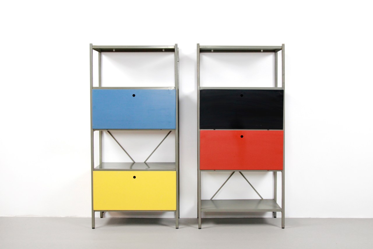 Deze set bestaat uit 2 kastjes, 1 in de kleuren Blauw en Geel en de ander in Rood en Zwart. Dit kan eventueel naar eigen smaak ook anders ingedeeld worden. Van deze no. 663 kasten zijn enkel 3000 exemplaren gemaakt. In 1959 werd wandrek no. 663 vervangen door het meer uitgebreide bergmeubel 5600, een ontwerp van Cordemeyer voor Gispen. Persoonlijk vinden wij het 663 model mooier, hij doet ons ook denken aan een ontwerp van Ray and Charles Eames. De hoogte per kast is 136,5 cm, de breedte is 64 cm en de diepte 33 cm.