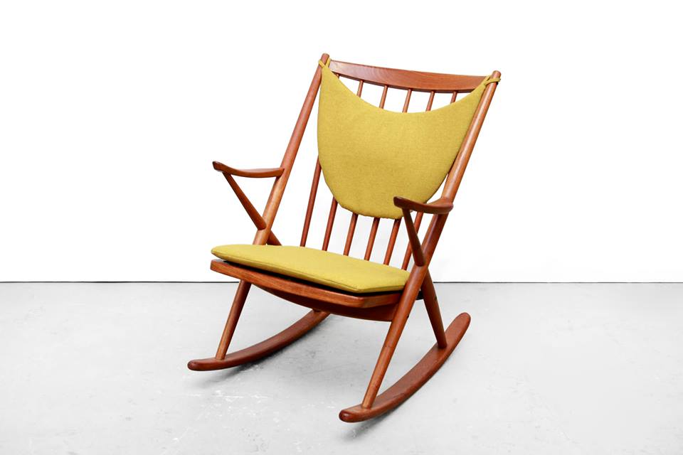 Omschrijving: Deze schommelstoel met modelnummer 182, is ontworpen door Frank Reenskaug in 1958 en gemaakt door Bramin. De stoel is gemaakt van massief teak hout en heeft een mosterd gele zitting en rugkussen. De fauteuil met hoge rugleuning zit erg comfortable en heeft licht gebogen armleuningen. Het lijnenspel van deze fauteuil maakt het een echte eye-catcher. De fauteuil is 83 cm hoog, 67,5 cm breed en 79 cm diep. De zithoogte is 42 cm.